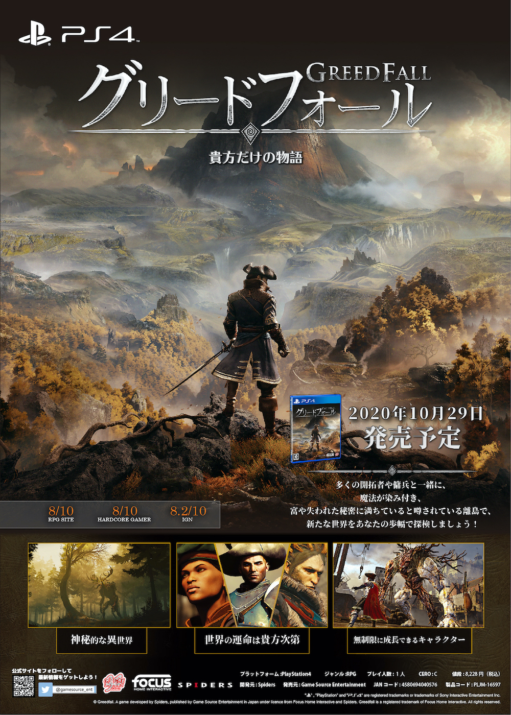 権利表記:Greedfall. A game developed by Spiders, published by Game Source Entertainment in Japan under licence from Focus Home Interactive and Spiders. Greedfall is a registered trademark of Focus Home Interactive. All rights reserved.